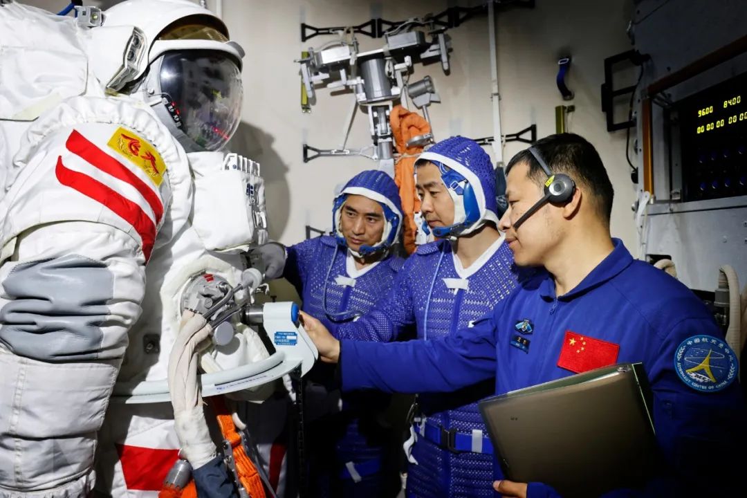 神舟二十号航天员乘组陈中瑞(左)、陈冬(中)、王杰进行出舱程序训练(徐部 摄)