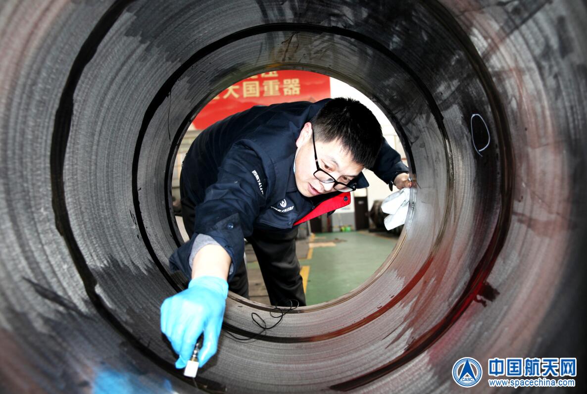 图为检验人员正在对刚刚加工完的产品圆筒做磁粉检测。 郭建华 摄