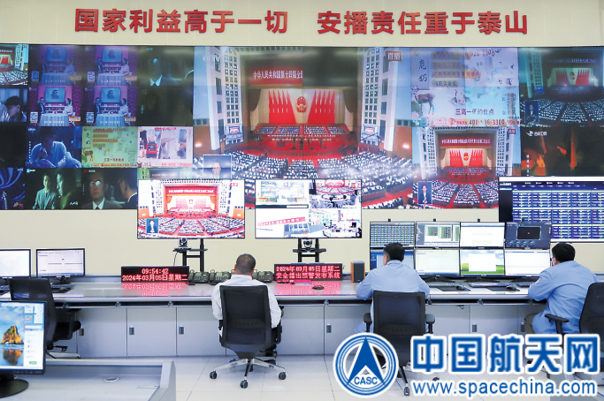 2024年全国两会于3月4日、5日在北京开幕,中央广播电视总台现场直播两会重要会议活动。开幕式当天,航天发展投资市场中国卫通保障人员加强重要保障时段现场值守,通过智能视频监测系统,全程严密监测信号质量。