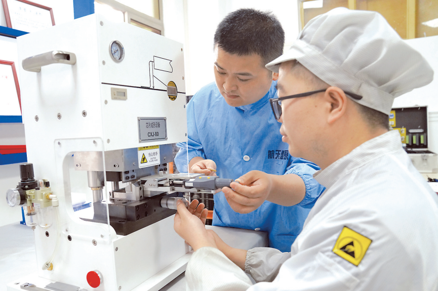图为四川工匠唐仁杰(左)和航天技术能手高理宾正在进行芯片成形功能测试。田勇国 摄