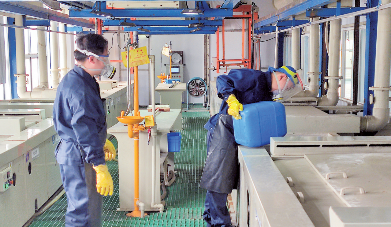 图为该厂电镀工正在进行设备维护保养。钟建峰 摄