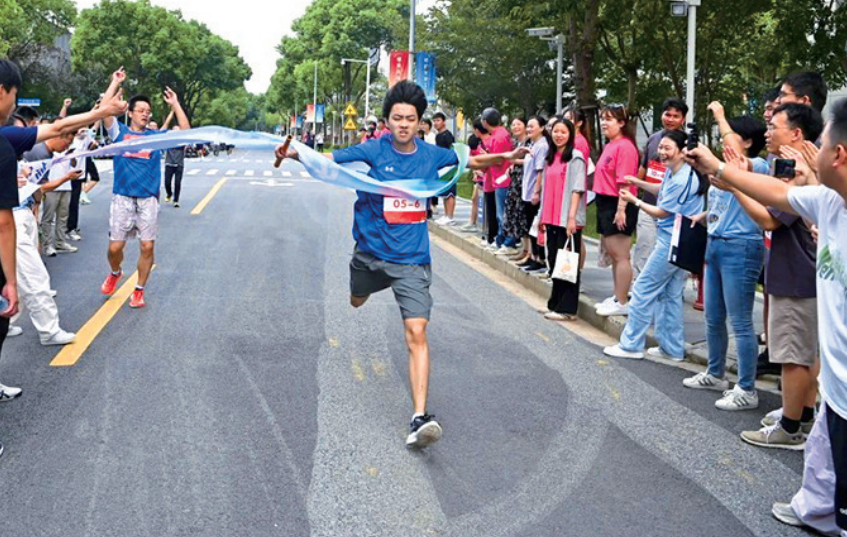 图为职工在接力跑中冲向终点。徐瑛琦 摄