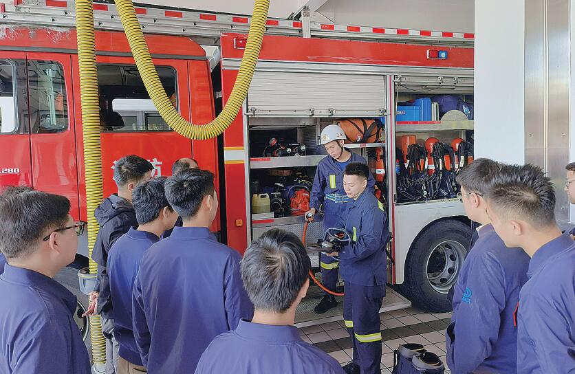 图为青年职工学习使用消防装备。董鑫宇 摄